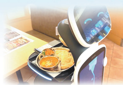 图为国产服务机器人在日本一家餐厅配送餐品。擎朗智能供图